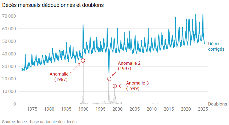 A partir des fichiers des personnes décédées produits par l'INSEE, l'équipe de data.gouv.fr propose une nouvelle façon d'accéder aux données, sous la forme d'un seul fichier agrégé. Vous pouvez retrouver la documentation ainsi que l'ensemble des précautions liées aux données dans la description du jeu de données d'origine. Pour toute question concernant le contenu des données, nous vous invitons à poser vos questions sur le jeu de données source. Les données sont identiques aux données sources, hormis :