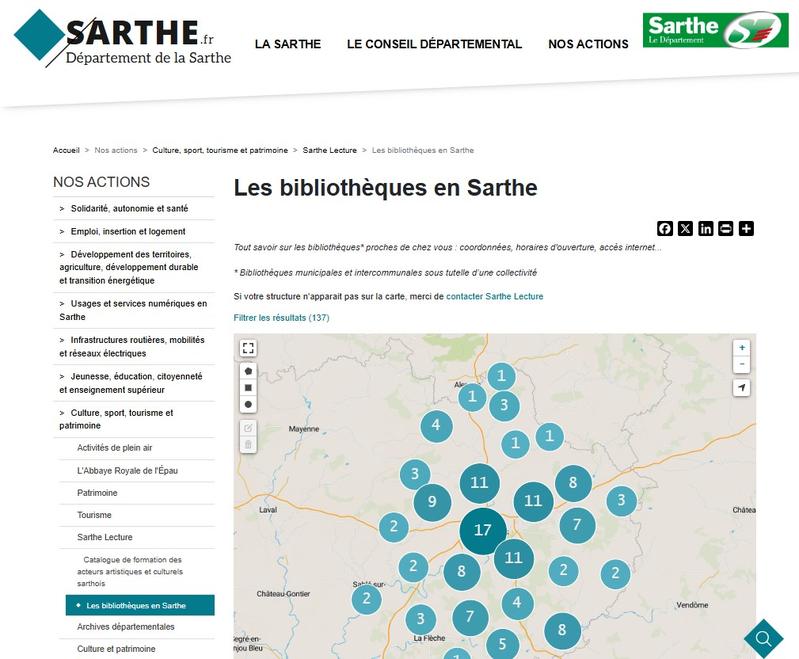 Les bibliothèques municipales et intercommunales sur le Département de la Sarthe. Les données ont été mises à jour en 2023.
