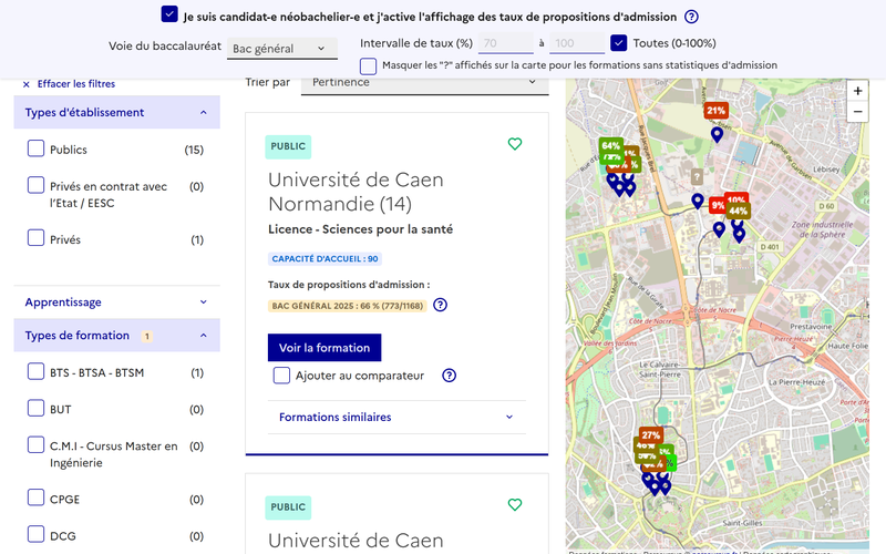 Taux d’accès 2025 : rapport entre le nombre de candidats dont le rang de classement est inférieur ou égal au rang du dernier appelé de son groupe et le nombre de candidats ayant validé un vœu pour la formation étudiée en phase principale (hors GDD - phase permettant de redistribuer les places laissées vacantes à l’issue de la phase principale aux néo-bacheliers sans proposition). Ce taux prend en compte l’ensemble des candidats ayant confirmé au moins un vœu en PP (les élèves de terminale, les étudiants en réorientation et les reprises d’études). Tous ces candidats n’ont pas intégré la formation, soit parce qu’ils ont eux-mêmes renoncé à cette formation avant de recevoir la proposition d’admission, soit parce qu’ils ont eu le choix entre plusieurs formations et ont au final accepté la proposition d’une autre formation. Si le taux est de 100 %, cela signifie qu'aucun candidat n’était en attente de proposition dans cette formation à la fin de la PP (hors GDD).