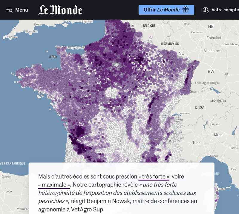 Coordonné par Le Monde, le baromètre de la « pression pesticides » est le fruit d’une collaboration de plusieurs mois avec un collectif pluridisciplinaire, constitué d'une dizaine d'experts, parmi lesquels Adrien Guetté (maître de conférences en géographie de l’environnement à l’université de Tours), Aurélien Chayre (ingénieur agronome à Solagro), Colin Fontaine (chargé de recherche CNRS - Centre d’écologie et des sciences de la conservation), Matthieu Mancini (docteur en épidémiologie, ingénieur bio-informaticien), Benjamin Nowak (maître de conférences en agronomie à VetAgro Sup - UMR Territoires), Karine Princé (chargée de recherche au Centre d’écologie et des sciences de la conservation), Stanislas Rigal (chargé de recherche à la Fondation pour la recherche sur la biodiversité), et des scientifiques du Joint Research Centre de la Commission européenne.