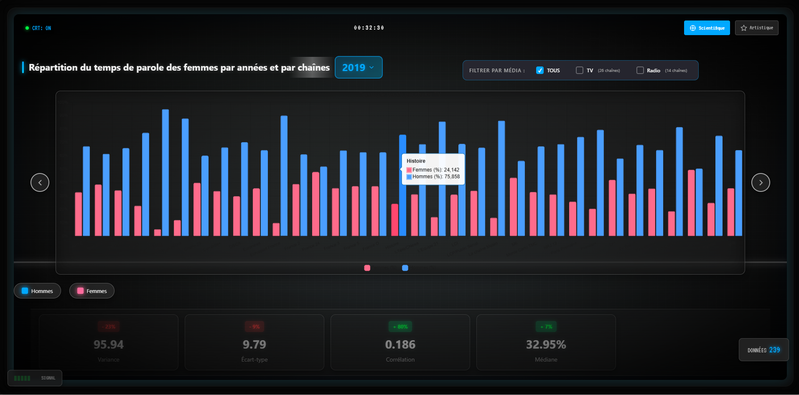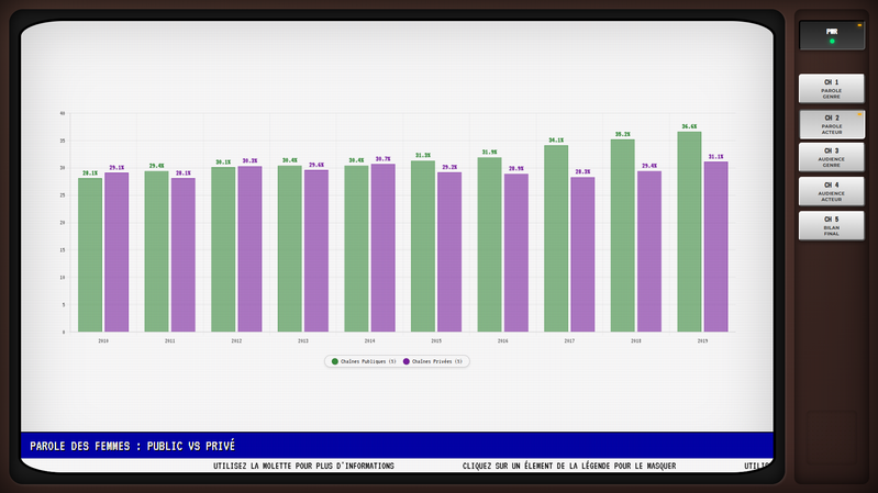 Temps de parole des hommes et des femmes, correspondant à plus d'un million d'heures de programmes diffusés de 1995 au 28 février 2019.