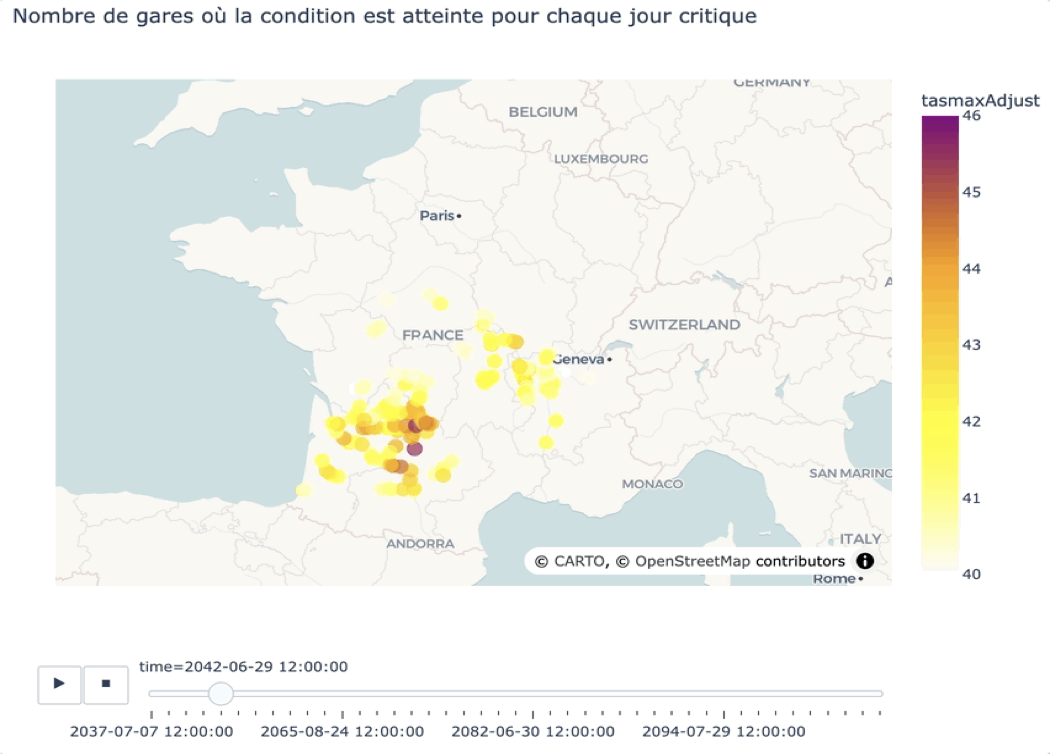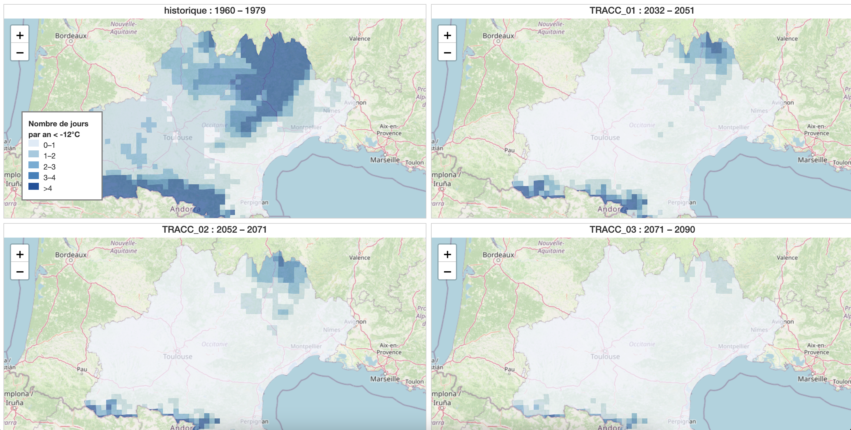 Indicateur "gel" cartographié par l'équipe "Biogéographie des cultures émergentes dans les climats de la TRACC”Equipe “Assurabilité dans le futur” : Etude du risque de canicule dans le passé et dans le futur et adaptation des solutions d’assurance paramétriques à ce risque ;