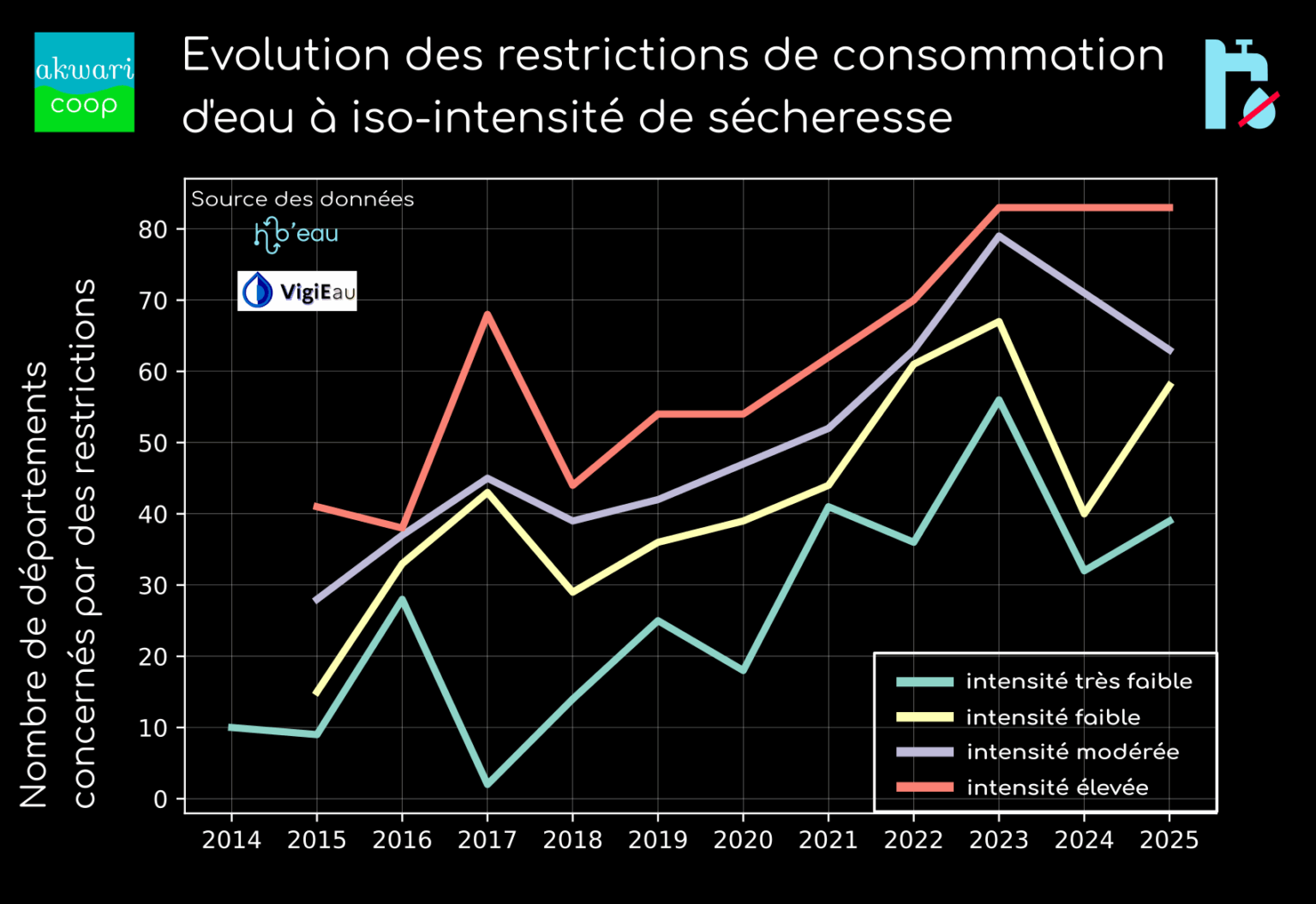 Le constat est clair : à intensité de sécheresse égale, le nombre de départements touchés pas des mesures de restriction de consommation d’eau augmente considérablement ces dix dernières années, ce qui montre une plus grande propension des pouvoirs publics à prendre des décisions plus précoces.