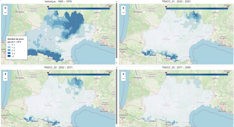 Il existe divers outils de projections des indicateurs agricoles au regard du changement climatique (ex : Climadiag), mais il est plus difficile de trouver des visuels cartographiques dynamiques qui projettent des données climatiques futures à une échelle territoriale pertinente pour informer les décisions pratiques et stratégiques à prendre pour l'avenir de l'agriculture.