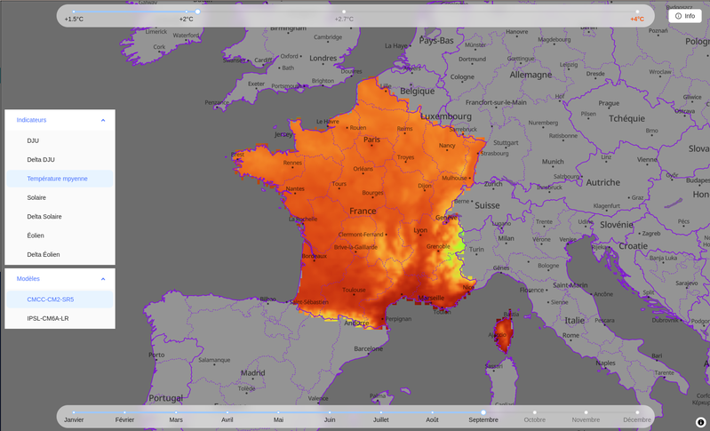 Cette solution se base sur la trajectoire TRACC , permettant d'explorer différents niveaux de réchauffement (+2,0°C, +2,7°C, +4,0°C) au pas de temps mensuel, couvrant l'entièreté du territoire métropolitain avec une résolution de 8km et intégrant plusieurs modèles climatiques. Un curseur permet de naviguer intuitivement entre les différents niveaux de réchauffement pour visualiser des impacts intermédiaires.