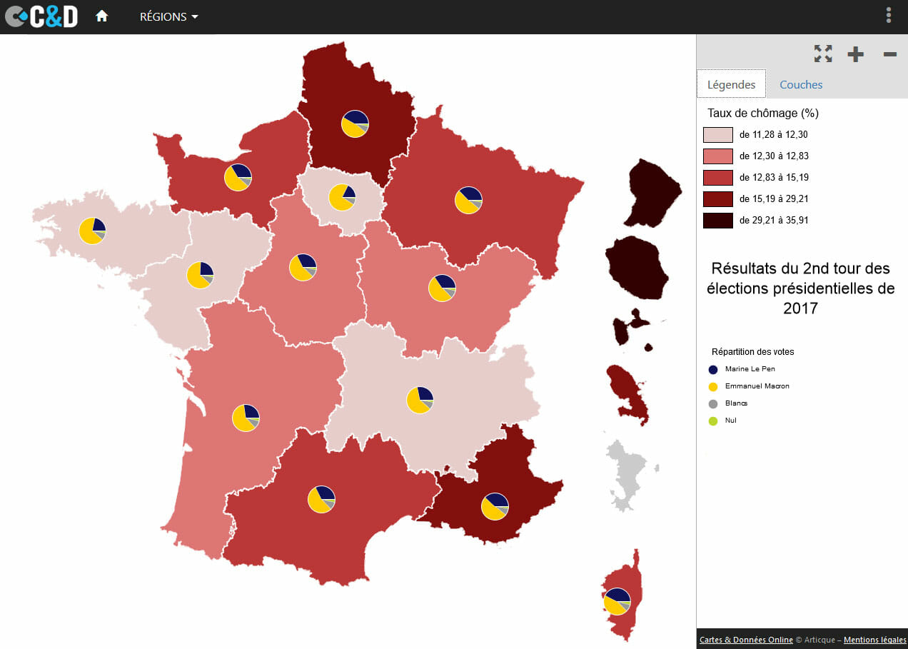 - Carte n°3 : candidat en tête des suffrages et répartition du taux de chômage (par région) - Cliquez ici pour agrandir cette carte
