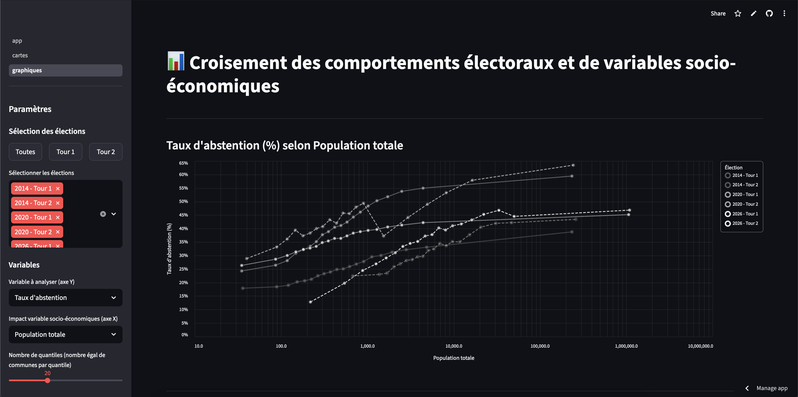 La page Graphiques permet d'explorer le croisement entre le taux d'abstention (ainsi que de participation, vote blanc, nuls et pour une tendance politique) et une dizaine de variables socio-économiques. Elle permet aussi de situer votre commune sur le graphique. Enfin, elle permet d'ajouter une stratification par type de communes, pour contrôler l'impact de la taille de la commune sur l'analyse d'un lien entre les variables socio-économiques et les comportements électoraux.