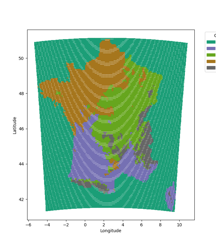 On utilise des techniques de clustering pour classer la France métropolitaine en différents types de climat ; puis on applique la règle de classification sur les projections, afin d’observer l’évolution des zones climatiques.