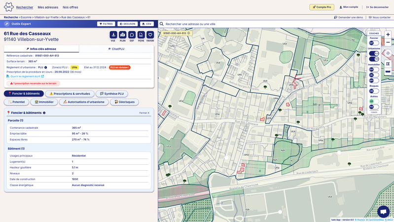 🗺️ D’une solution cartographique centralisant de nombreuses informations clés sur une adresse (données foncières et bâtimentaires, zone PLU, risques, servitudes, propriétaires moraux, copropriétés, autorisations d'urbanisme, DVF…)