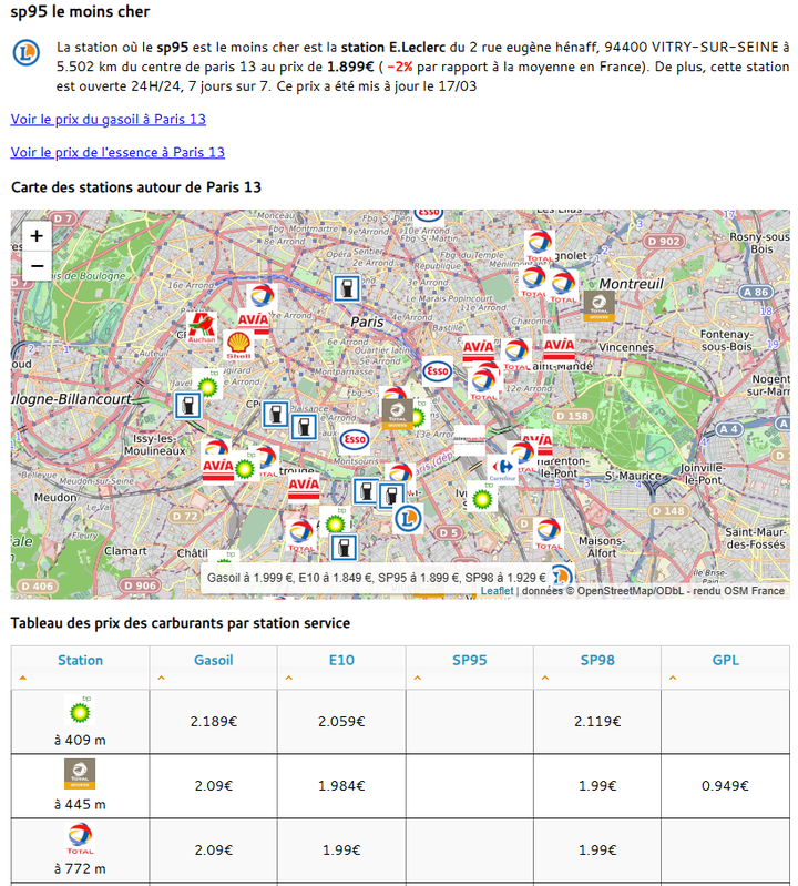 mise en avant du prix des carburants en France. recherche par ville et par station. Prix mis à jour toutes les heures. Disponible sur mobile comme sur ordinateur de bureau. Carte + tableau des prix, comparaison dans le secteur géographique recherché