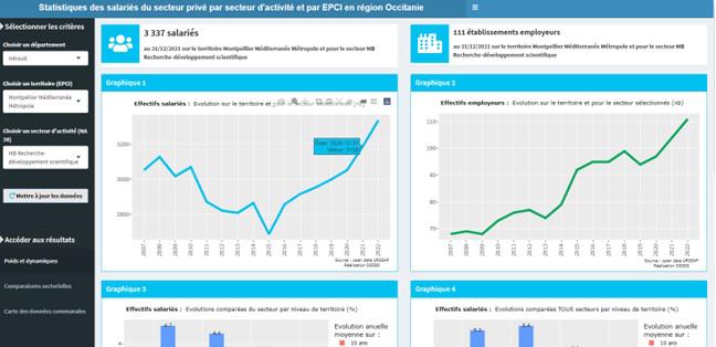 C’est un outil de visualisation interactive des statistiques de salariés et d’établissements employeurs (champ URSSAF du secteur privé hors agriculture), par territoire d’EPCI choisi sur un département en région Occitanie et par secteur d’activité sélectionné.