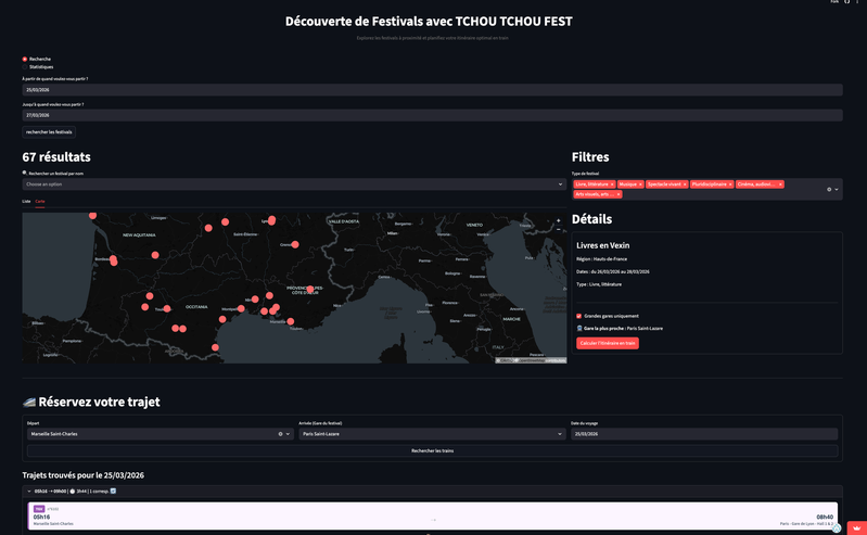 Comment faire du déplacement en train un incontournable de la culture du festival ? Ce projet étudiant relie culture et mobilité en train. L'application calcule la gare la plus proche d'un événement, puis interroge l'API SNCF pour générer un itinéraire précis.