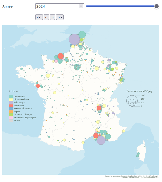 Carte interactive des émissions 2005-2024 de CO2 SEQE-UE en France hexagonale + Corse